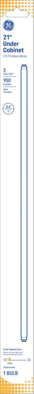 GE Light Bulb, Wattage Rating: 13 W, Lamp Base: G5 Miniature, Lamp Shape: T5, Lamp Material: Sodalime, Lumens: 870 Lumens, Color Temperature: 3000 K, Color Rendering Index (CRI): 52, Average Life: 5000 hr, Start Type: Rapid, Dimensions: 0.63 in Dia x 21 in L