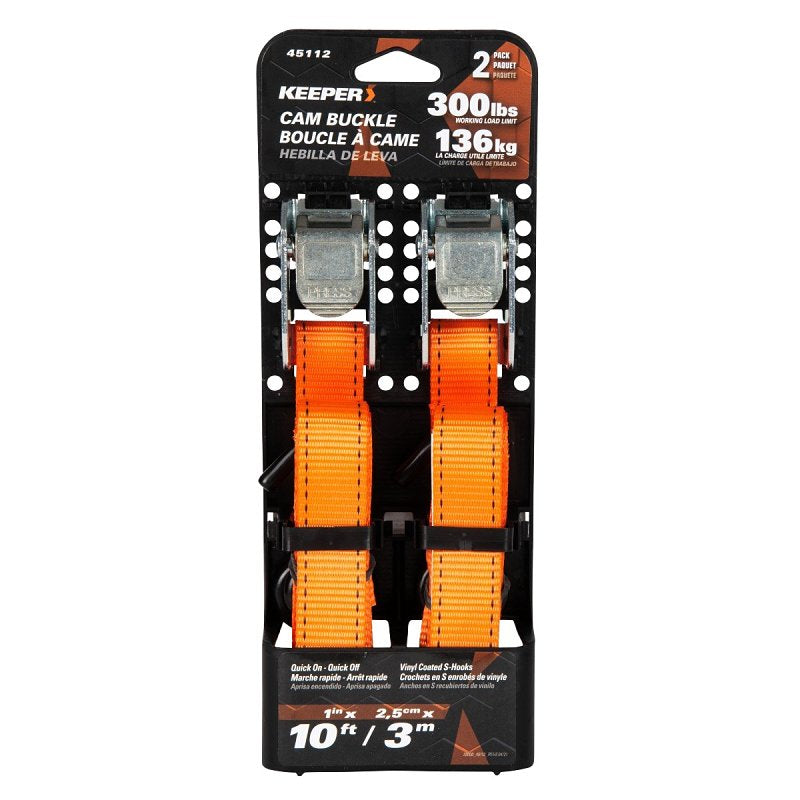 Cam buckle tie-downs are the fastest and easiest way to secure your cargo. Unlike rope and twine, they work without having to tie knots. Cam buckle tie-downs combine security with speed. Small teeth grip webbing tight and a thumb release lever makes using them quick and easy.